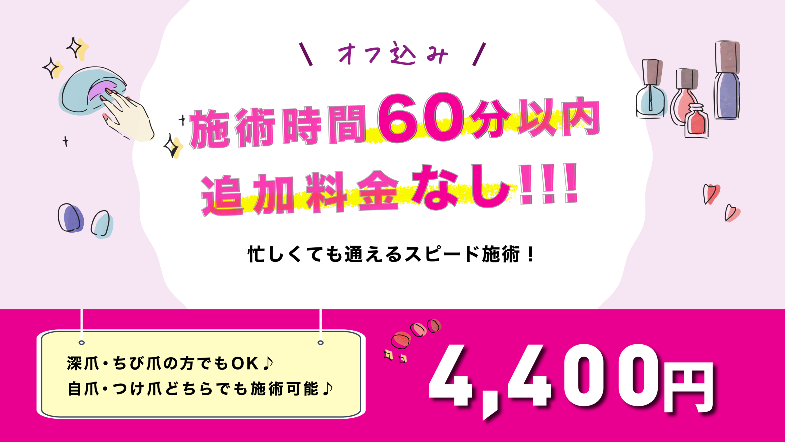 A. 追加料金は一切発生しません。ハンドネイルは一律3,850円(税込)で対応させていたします。